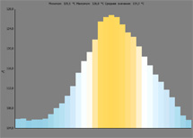Термопрофилограмма, построенная по вертикальной профильной линии Р (рис.1, а) и приведенная на рис. 2, наглядно показывает увеличение температуры в районе газового стыка, что указывает на возможный дефект прокладки, установленной в месте стыка головки и блока цилиндров.